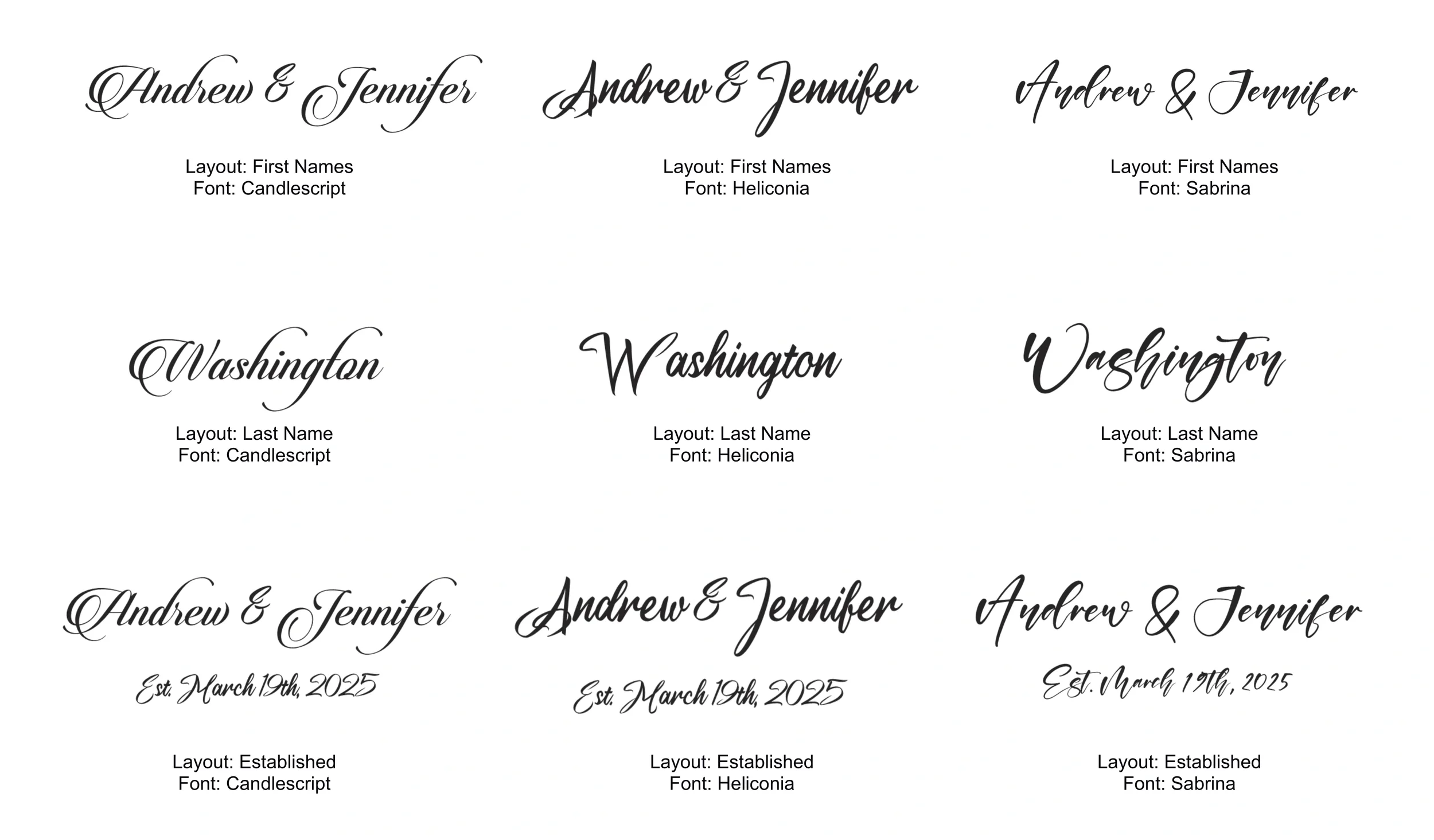 Step 2: Determine font you prefer from examples below (Candlescript, Heliconia, or Sabrina).