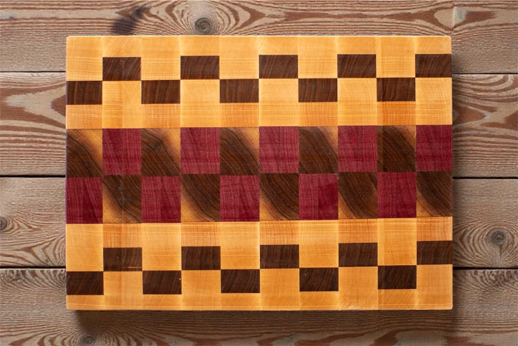 End Grain Cutting Boards are planed, then recut to form a beautiful pattern. The board is then reglued, sanded, lasered, resanded, oiled, waxed, then four rubber feet are mounted with stainless steel screws.